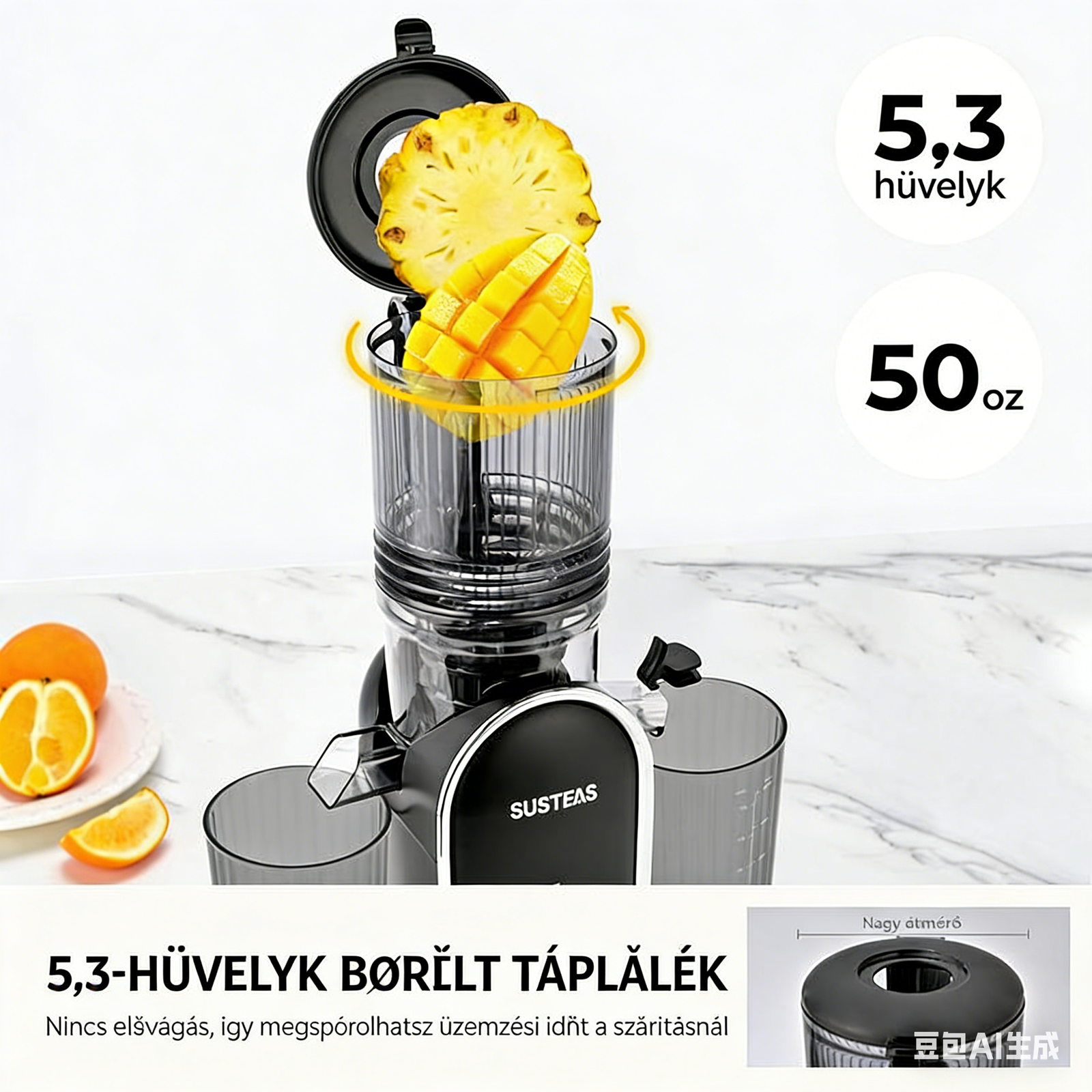 Ez a SUSTEAS hidegen sajtol¨® gy¨¹m?lcscentrifuga mindent megv¨¢ltoztat! A 13,7 cm sz¨¦les adagol¨®ny¨ªl¨¢sba eg¨¦sz alm¨¢k f¨¦rnek ¨C nem kell apr¨ªtani. A nagy hozam kevesebb hullad¨¦kot jelent, ¨¦s k?nnyen tiszt¨ªthat¨® is.